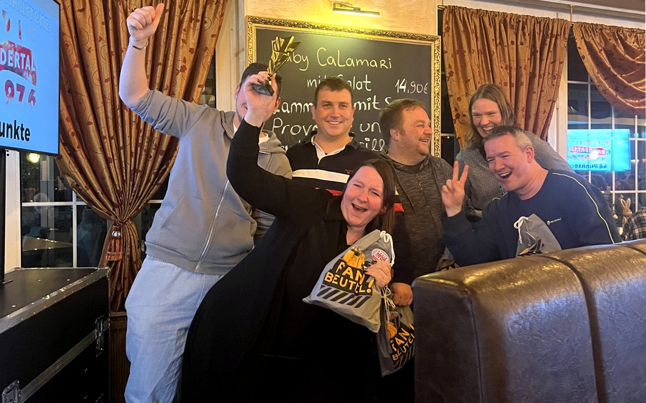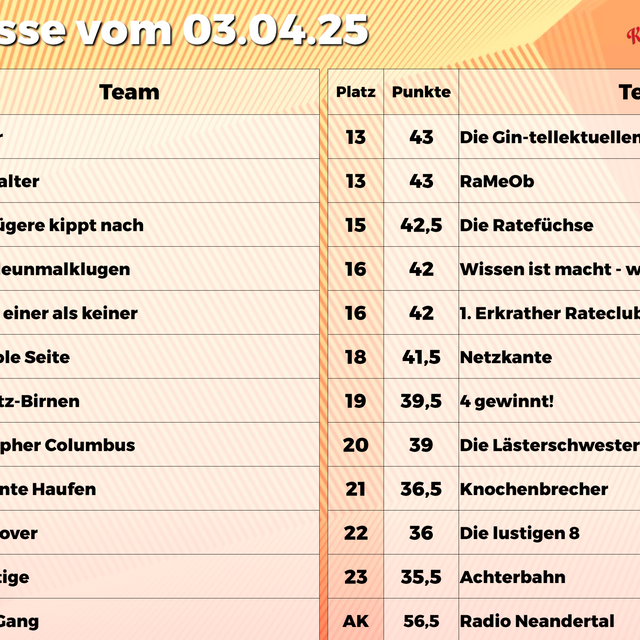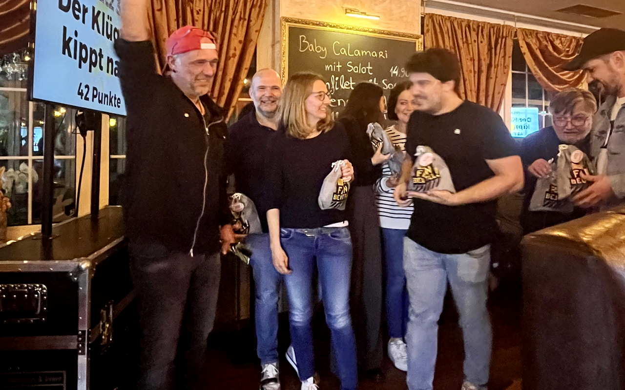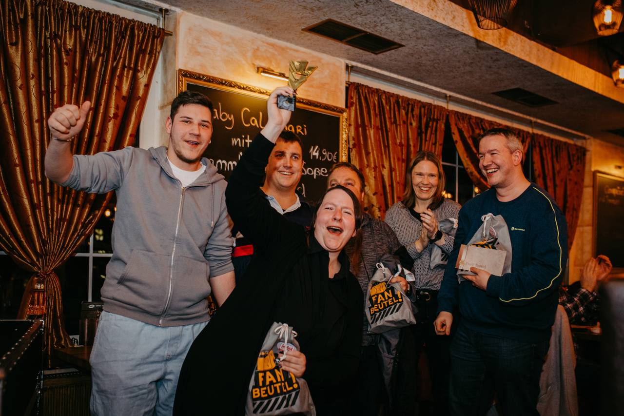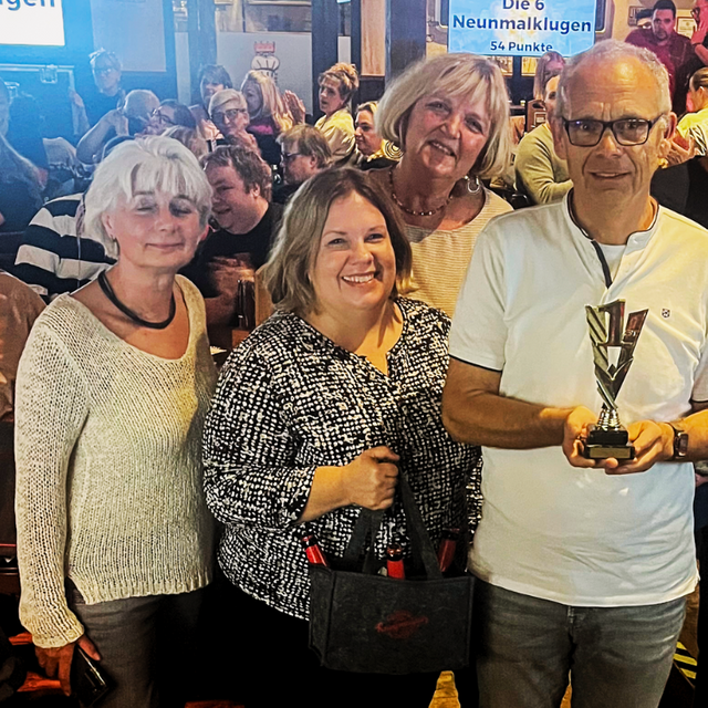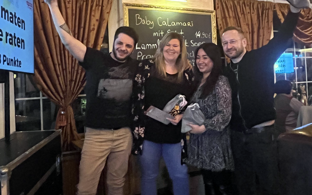 Am besten hat am Ende „Der bunte Haufen“ abgeschnitten, auf Platz 2 waren die „Primaten, die raten“ und auf Platz 3 „Der Klügere kippt nach“, unsere Titelverteidiger aus dem ersten Kneipenquiz in Velbert. Die hatten sogar einen Pokal gebastelt, der jetzt als Wanderpokal auf die Reise geht.
