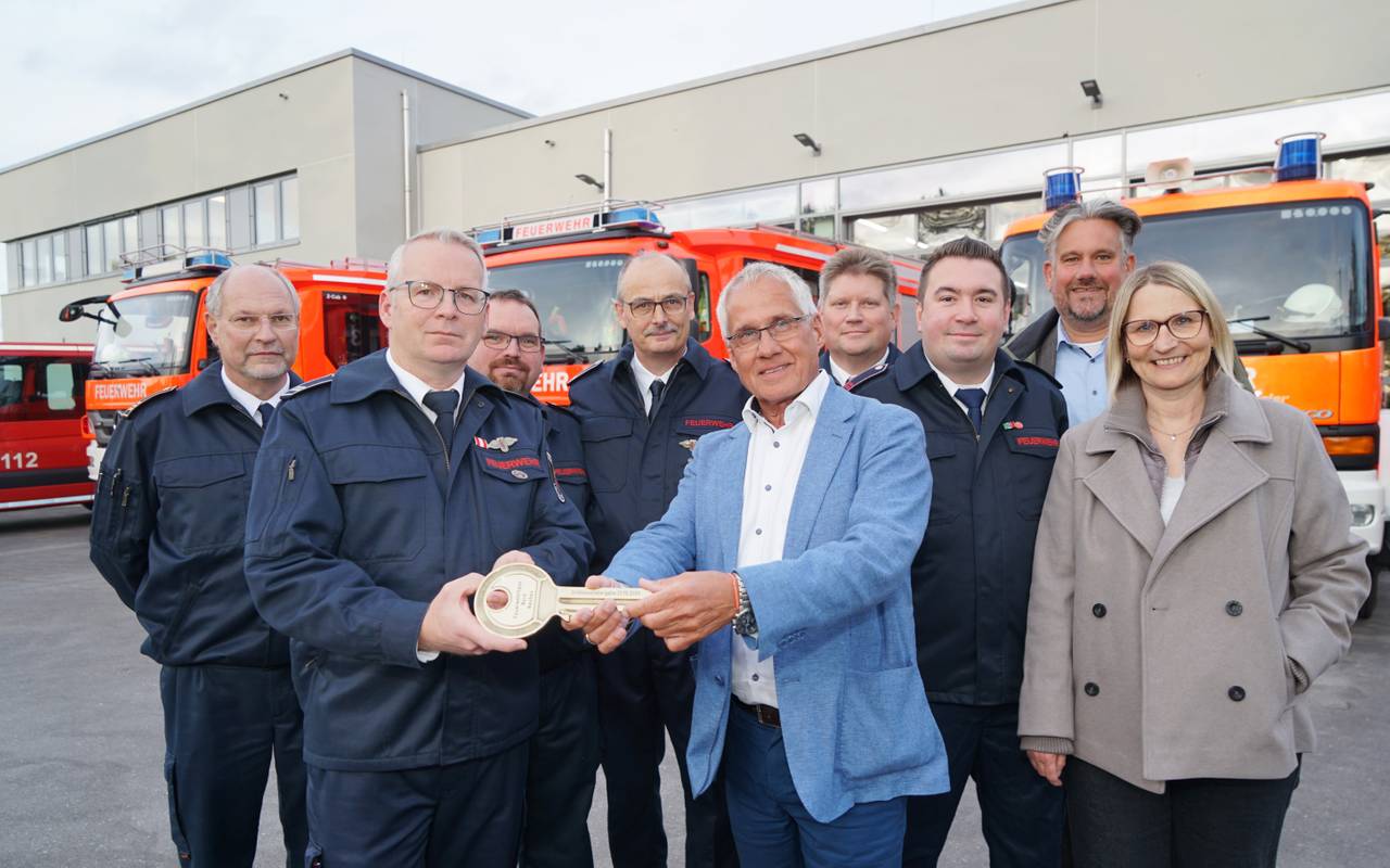 Das neue Feuerwehrhaus Nord an der Haus Gravener Straße in Langenfeld ist so gut wie fertig. Bürgermeister Frank Schneider hat der Feuerwehr jetzt den Schlüssel übergeben, meldet die Stadt.