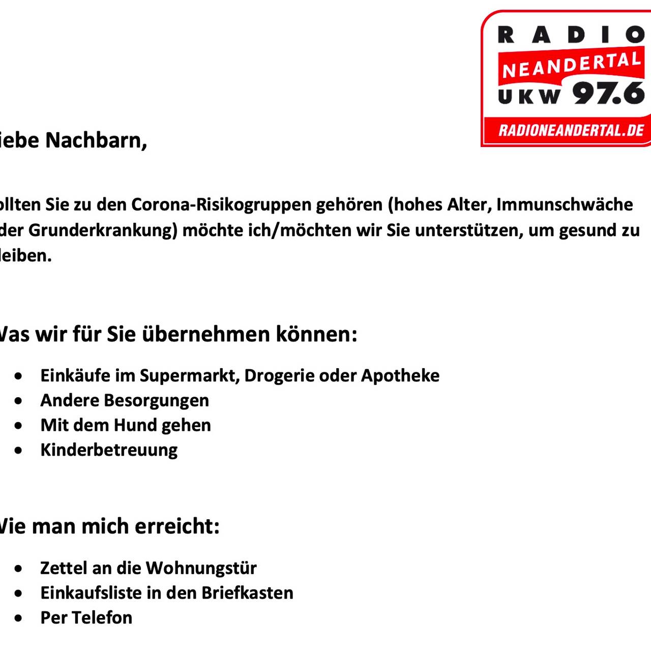 Viele Menschen wollen vielleicht irgendwie helfen, wissen aber nicht wie. Wir haben für euch eine Din-A4- Seite erstellt, die ihr nur ausdrucken müsst und dann ggf. bei euren Nachbarn in den Briefkasten legen oder im Treppenhaus aufhängen könnt.