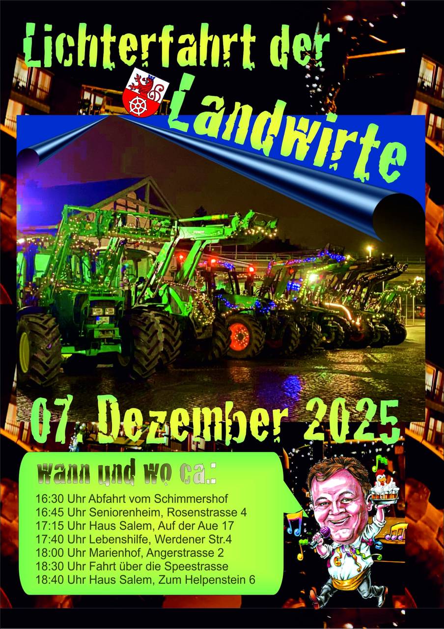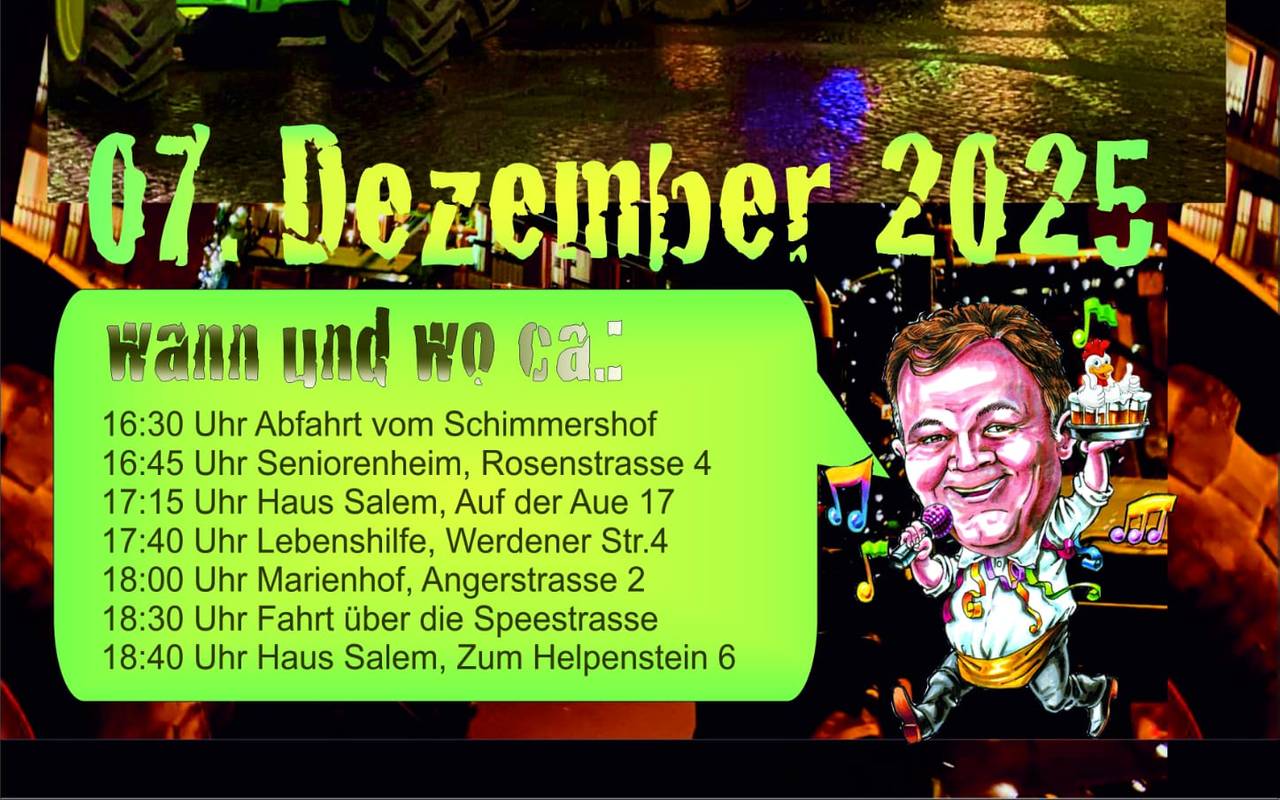 Rund 25 Landwirte machen bei der Ratinger Lichterfahrt mit. Sie starten gegen 16:30 Uhr auf dem Schimmershof in Tiefenbroich. Erst geht es gegen 16:45 Uhr zum Seniorenheim auf der Rosenstraße. Danach folgen unter anderem noch Halte am Haus Salem und an der Ratinger Lebenshilfe. Gegen 18:30 Uhr wollen die Traktoren über die Speestraße fahren. Die Ratinger können sich auf geschmückte, funkelnde Traktoren mit Figuren und Selbstgebasteltem freuen, hat uns Organisator Johannes Paas im Radio Neandertal-Interview gesagt.