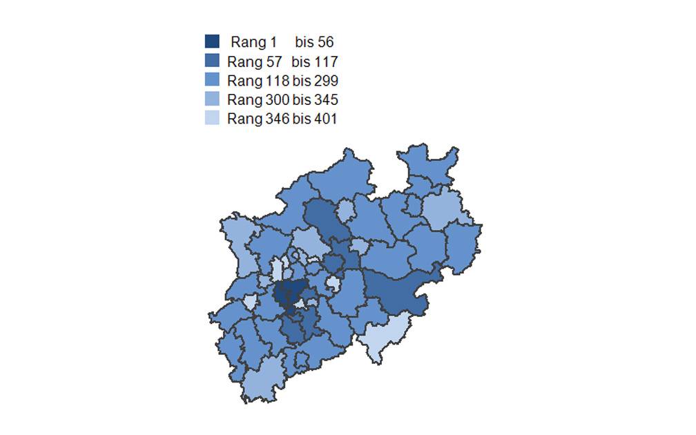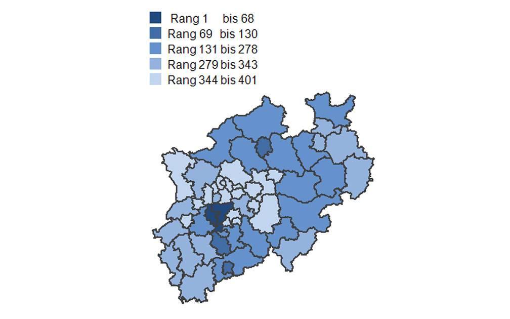 Ein ernüchterndes Ergebnis aus NRW-Sicht. Auch in vielen Landkreisen außerhalb der Ballungsgebiete im Ruhrgebiet und Umgebung haben schlecht abgeschnitten. Beispiel: Die ost-westfälischen Landkreise sind bis auf die Ausnahme Gütersloh allesamt nicht unter den Top 300 vertreten. Ähnlich sieht es am Niederrhein und im westlichen Rheinland aus. Die Metropolen Köln und Bonn machen es gegenüber benachbarten Landkreisen deutlich besser.