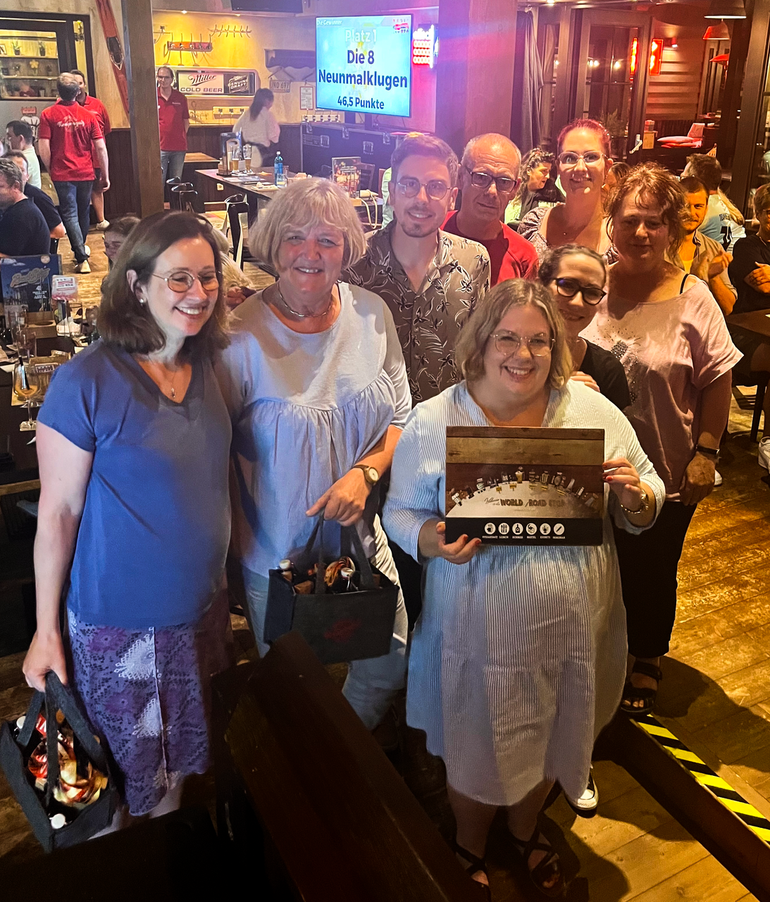 Diesmal waren wir in Mettmann im Roadstop. Den Wanderpokal mit nach Hause nehmen konnten „Die 8 Neunmalklugen“. Auf Platz 2 landeten die „23-12er“ und auf Platz 3 „Der bunte Haufen“, die Gewinner von Ratingen im Juni. Für alle, die diesmal nicht schnell genug waren, um Tickets zu ergattern: wir kommen nochmal dieses Jahr. Im November in eine weitere Stadt im Kreis Mettmann. Wir sagen früh genug Bescheid, wenn die Karten im Verkauf sind.