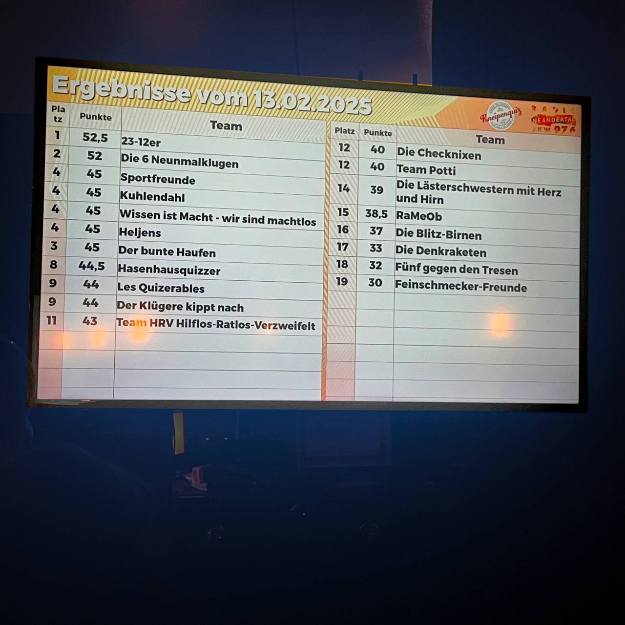 Das erste Radio Neandertal Kneipenquiz 2025 startete mit einer Besonderheit: es war das erste mit einer speziellen Neviges-Runde. 19 Teams sind im Restaurant „Wohnzimmer“ in Velbert-Neviges gegeneinander angetreten - alte Bekannte, aber auch viele Newcomer.