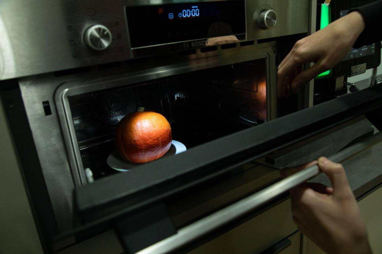 Kürbis ist in einer Mikrowelle zu sehen