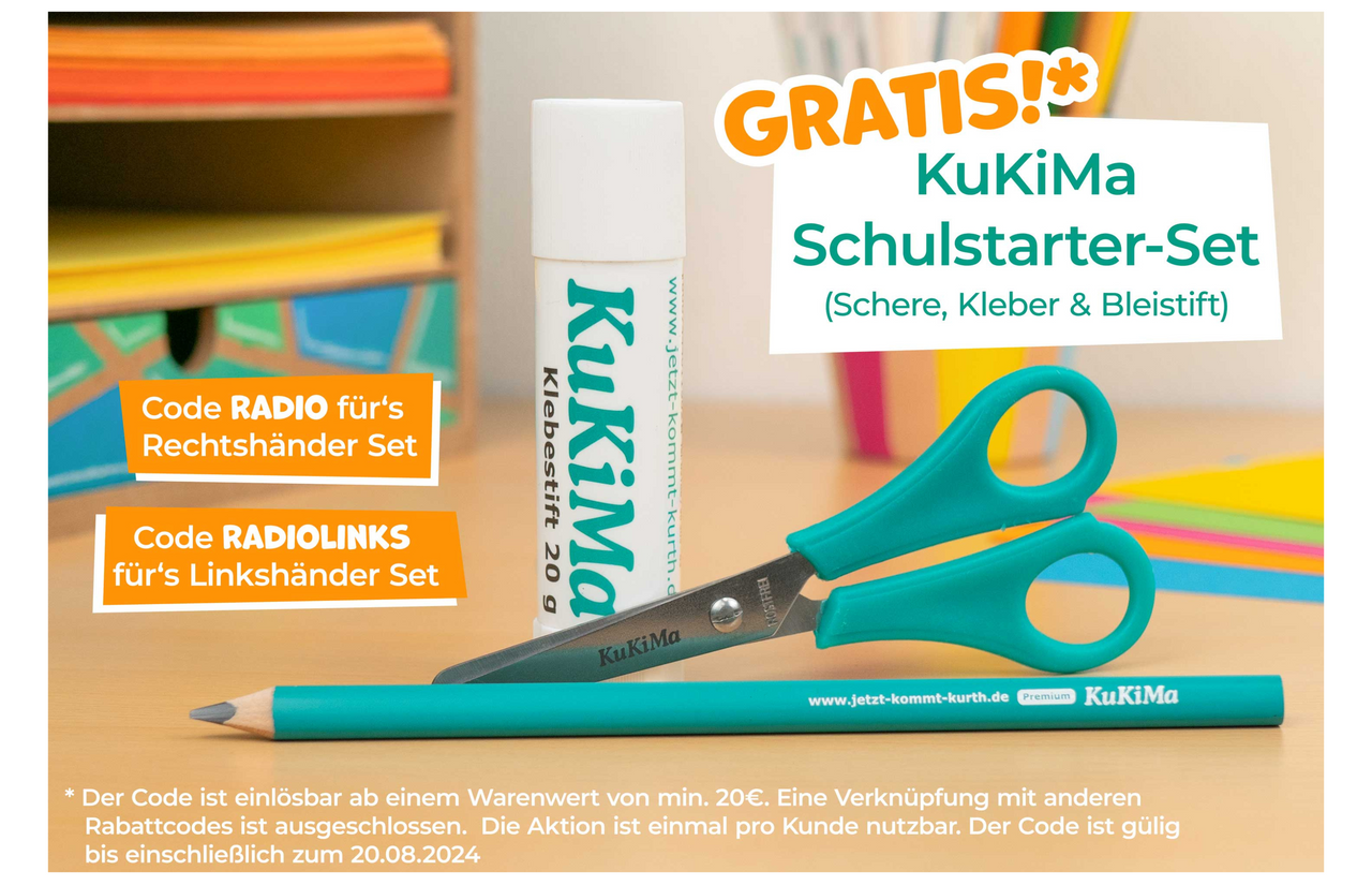 Und wer seine Utensilien bei "Jetzt kommt Kurth ..." bestellt, erhält ab einem Einkaufswert von 20 Euro sogar noch ein gratis Schulstarter-Set geschenkt*, erhältlich für Links- und Rechtshänder!