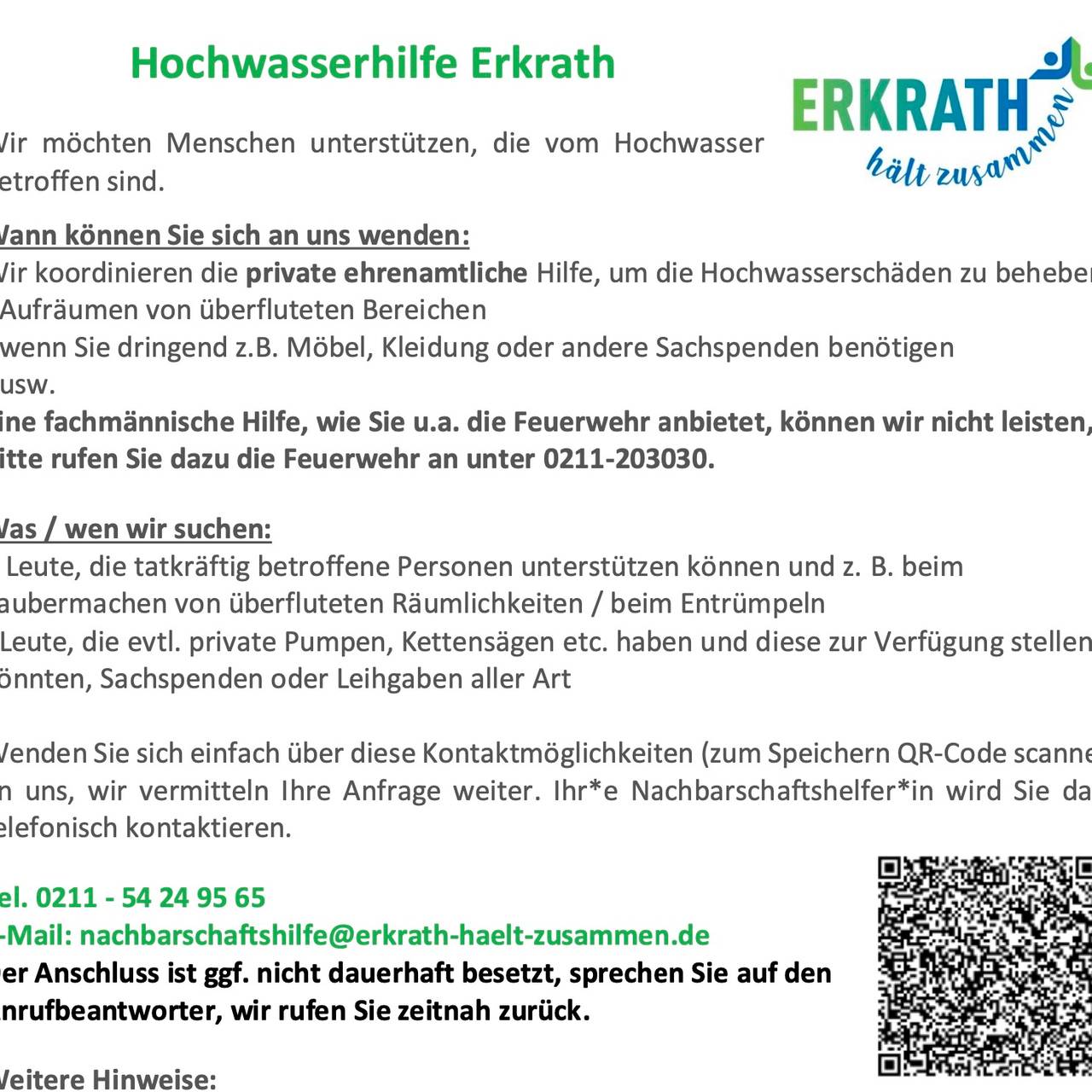 Der Verein Erkrath hält zusammen hat auch eine Hochwasser-Hilfe organisiert. Für detailierte Infos öffnet bitte die pdf-Datei.