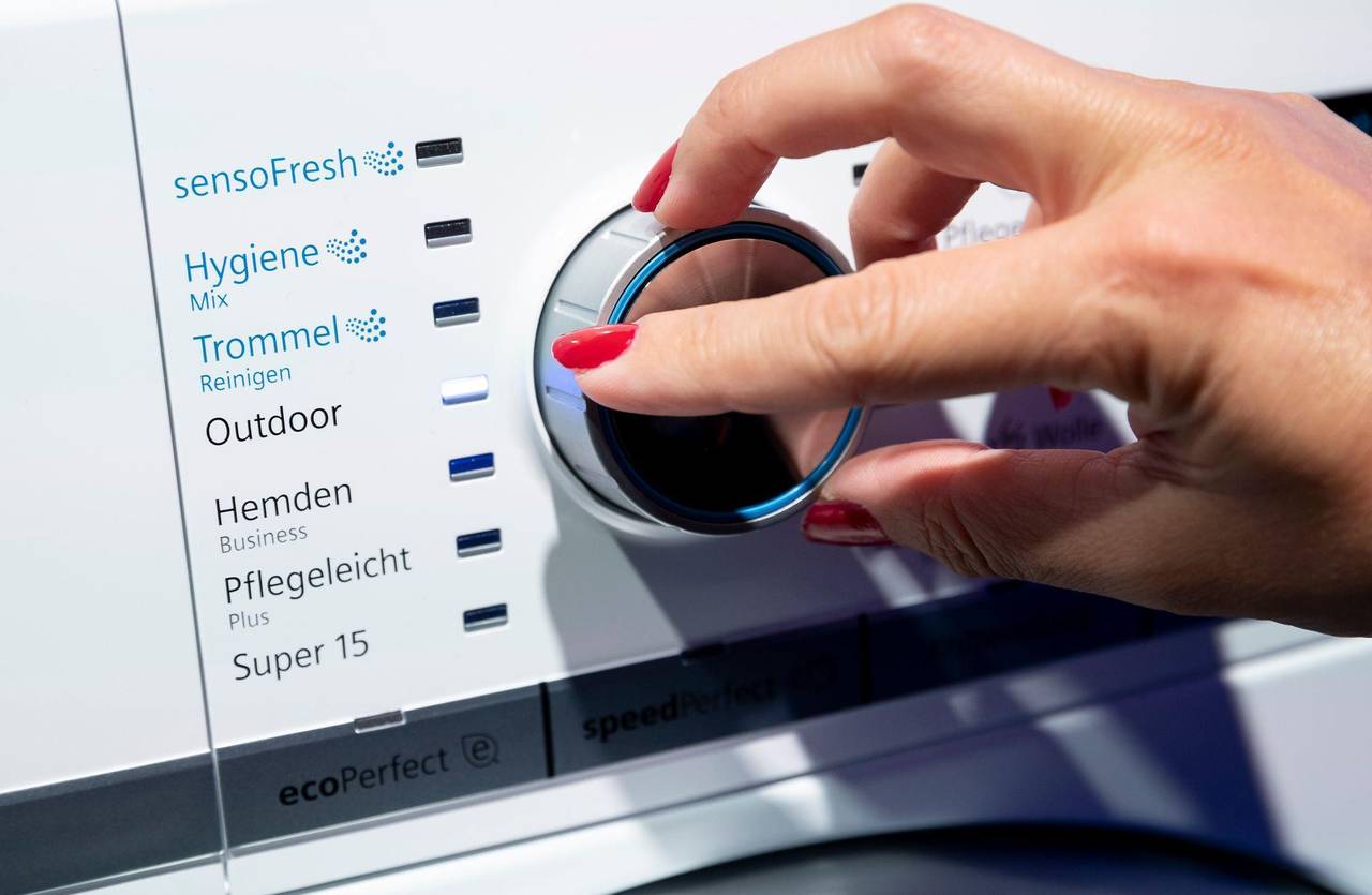 Eine Frau dreht einen Knopf an einer Waschmaschine