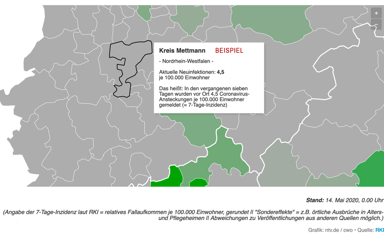 In Nordrhein-Westfalen ist ein Landkreis zurzeit schwer betroffen. Coesfeld hat aufgrund eines Coronavirus-Ausbruch beim Fleischvermarkter Westfleisch deutlich mehr als die maximale Obergrenze. Es sind (Stand: 14. Mai, 0 Uhr) 104,1 Coronavirus-Neuansteckungen pro 100.000 Einwohner in den vergangenen sieben Tagen registriert worden. Seitdem gibt es in diesem Kreis spezielle Corona-Auflagen und -Maßnahmen. Solange, bis die Zahl wieder unter 50 ist.
