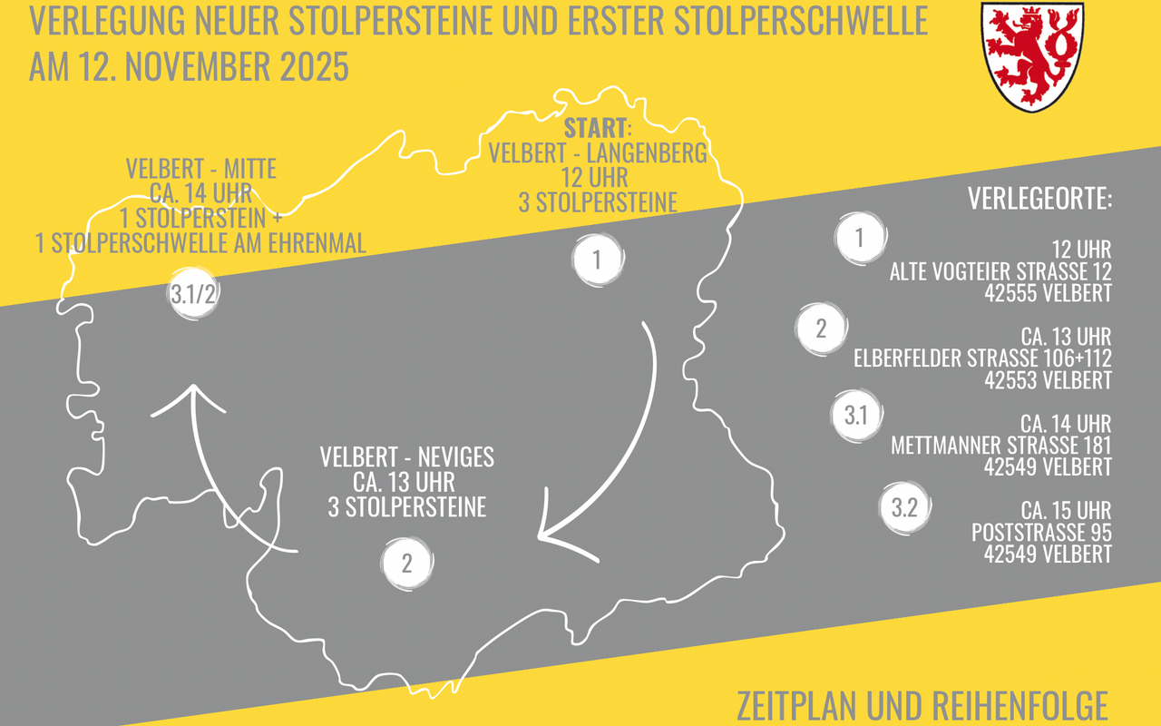 In Velbert werden bald (12.11.) neue Stolpersteine verlegt – und zum ersten Mal in der Stadt auch eine Stolperschwelle. Das hat der Bergische Geschichtsverein angekündigt.