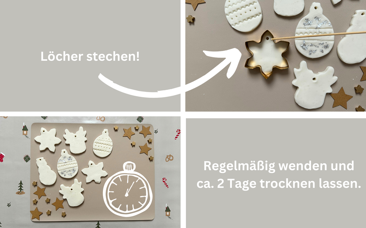 Der Teig muss zum Trocknen nicht zwingend in den Ofen. Es ist sogar besser, ihn einfach bei Zimmertemperatur trocknen zulassen, denn dadurch sinkt das Risiko der Rissbildung und außerdem bleibt er strahlend weiß. Beim Trocknen in Zimmertemperatur solltet ihr allerdings 2-3 Tage einplanen, bevor ihr mit dem Verzieren beginnen könnt. Wer geduldig abwartet, wird dafür anschließend mit einem wunderschönen Ergebnis belohnt. Das Warten lohnt sich also!