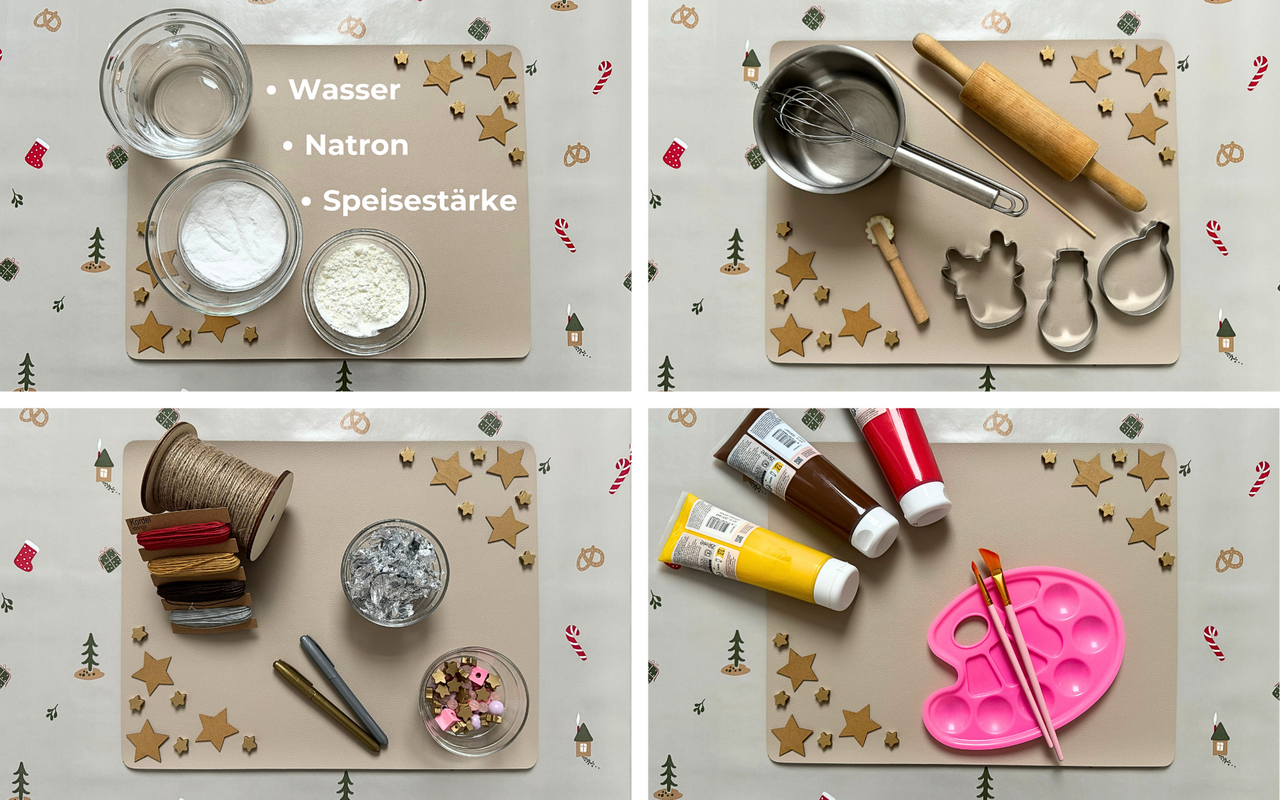 Nach 5-10 Minuten könnt ihr den Teig ausrollen und Formen ausstechen. Wer aus dem Teig Weihnachtsbaumschmuck basteln möchte, muss unbedingt an die Löcher zum Aufhängen denken. Dafür könnt ihr einfach mit einem Zahnstocher, einem Schaschlik-Spieß oder auch mit einem Stift ein Loch stechen. Setzt das Loch jedoch nicht zu nah an die Kante, damit der Teig dort während des Trocknens nicht einreißt.