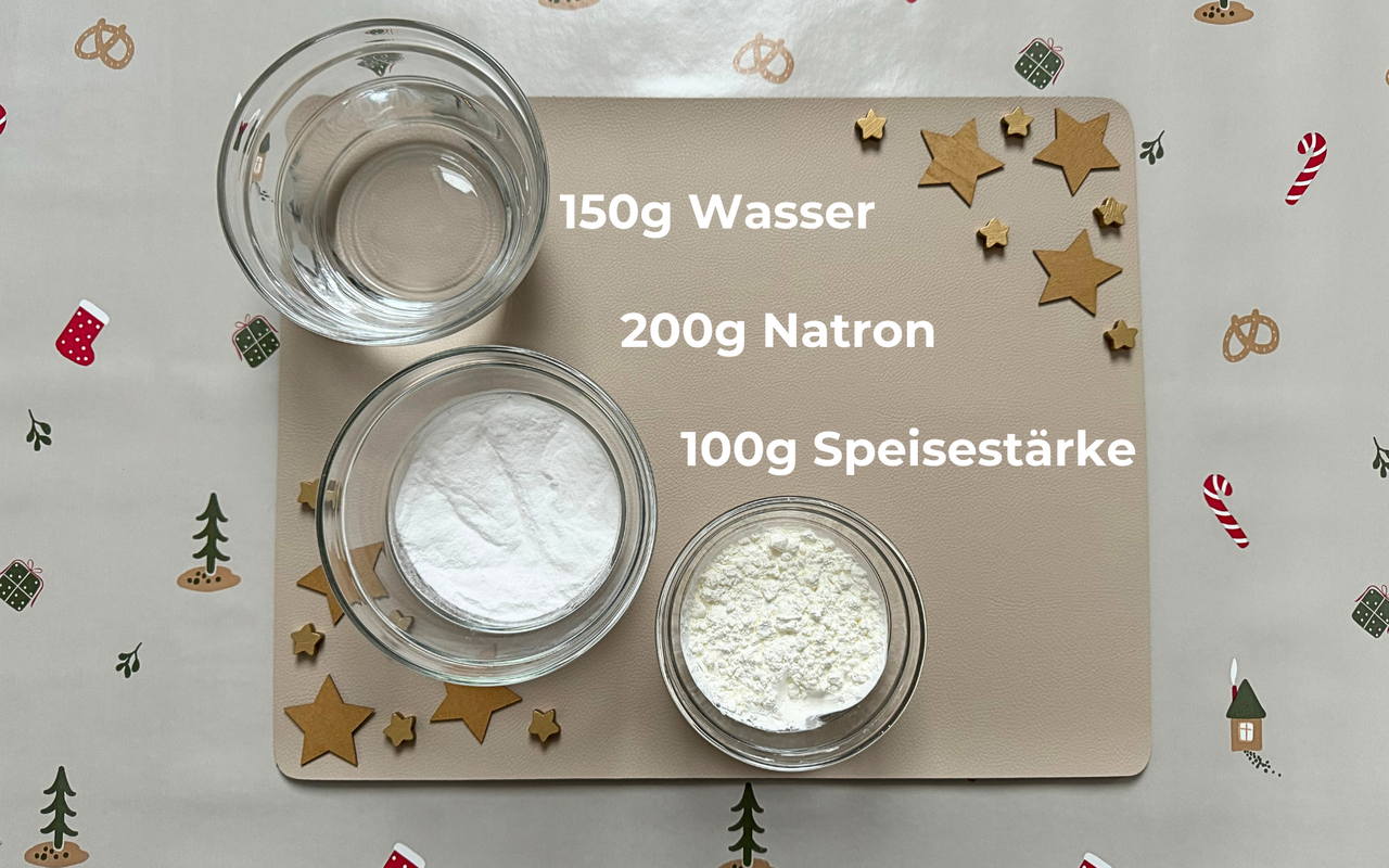 Natron und Speisestärke in einem Topf miteinander vermischen. Anschließend das Wasser hinzugeben und unter kontinuierlichem Rühren langsam erhitzen. Die Mischung beginnt nach einiger Zeit zu blubbern und wird immer fester. Sobald die Konsistenz festem Kartoffelpüree ähnlich ist, kann der Topf vom Herd genommen werden.